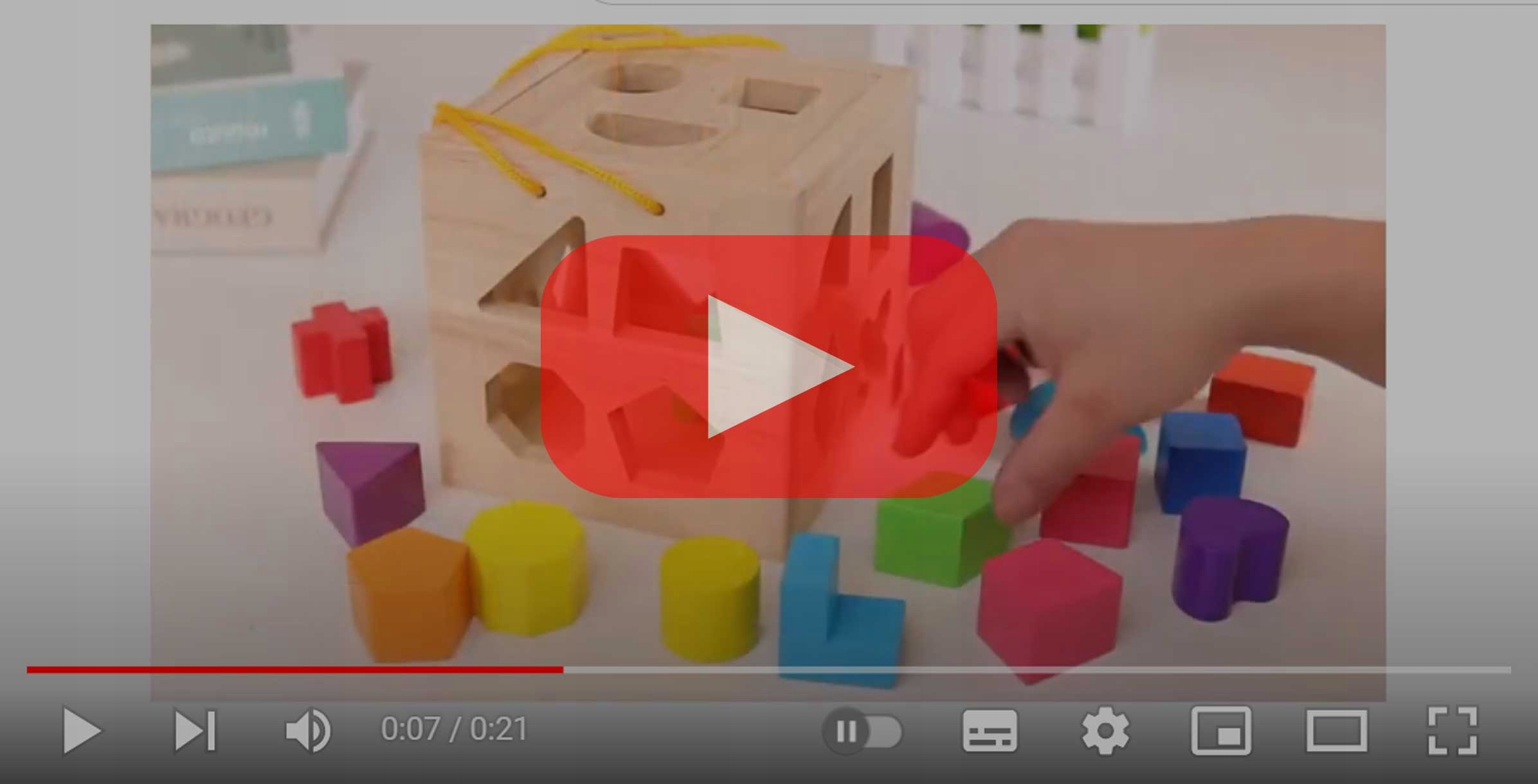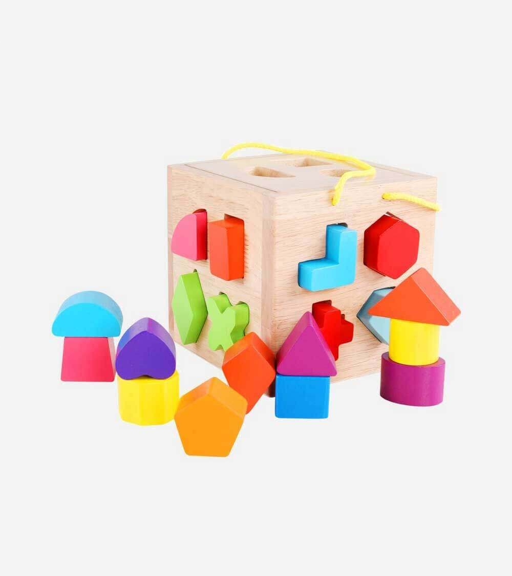 Куб із міцної деревини містить 19 різних різнокольорових фігур, які маленькі ручки дитини можуть легко схопити.