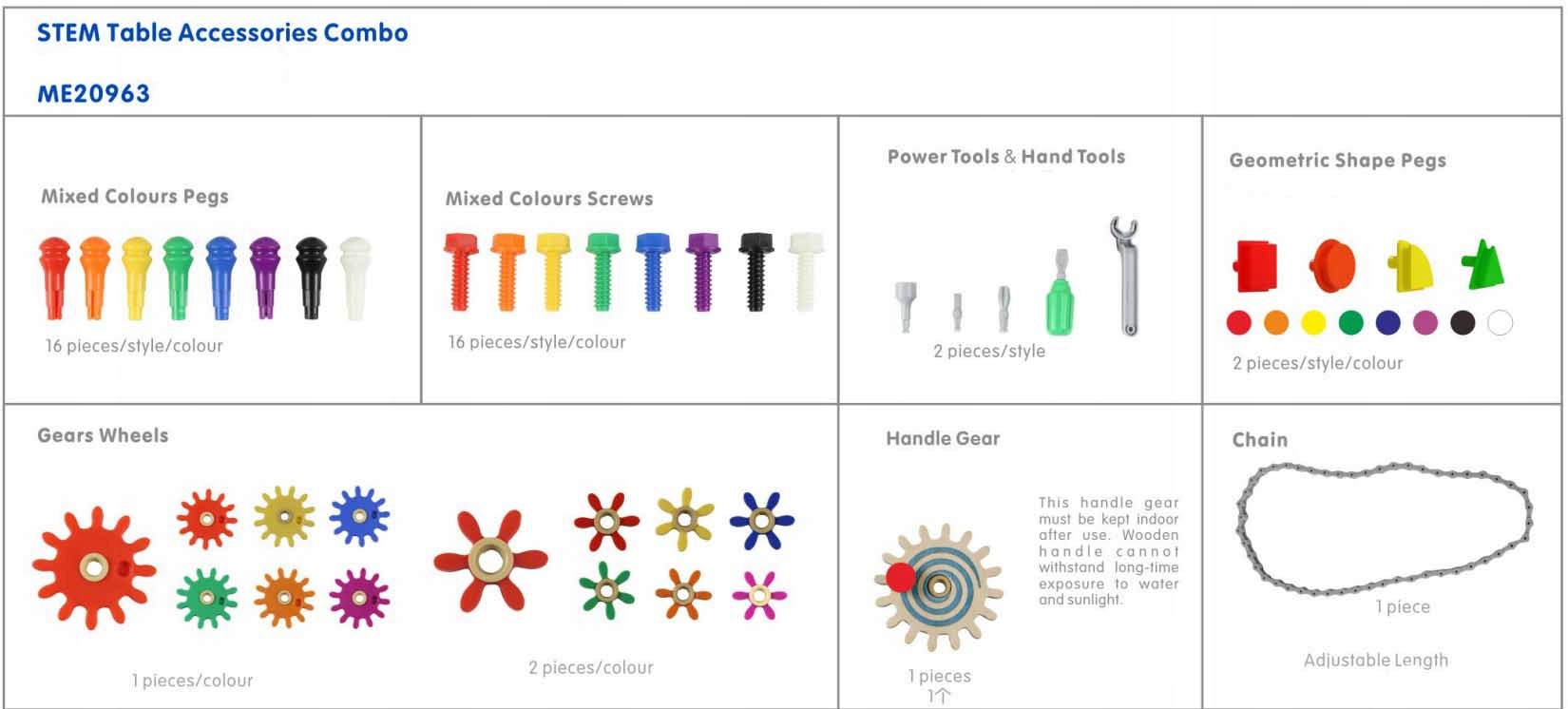 Навчальний стіл Masterkidz STEM + аксесуари дозволяють творчо грати та досліджувати світ науки. Панель розміром 63 x 63 (см) має отвори, у які можна створювати красиві візерунки, вставляючи кольорові та геометричні шпильки, гвинти, шестерні.