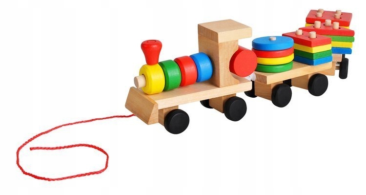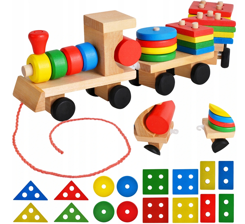 Барвистий дерев'яний поїзд, який складається з багатьох частин для самостійного збирання, привертає увагу дитини та спонукає до гри. Набір складається з паровозика з різнокольоровими кільцями та двох вагончиків (із шпильками) на колесах, які також є сортером, а також блоків різного кольору та геометричних фігур.
