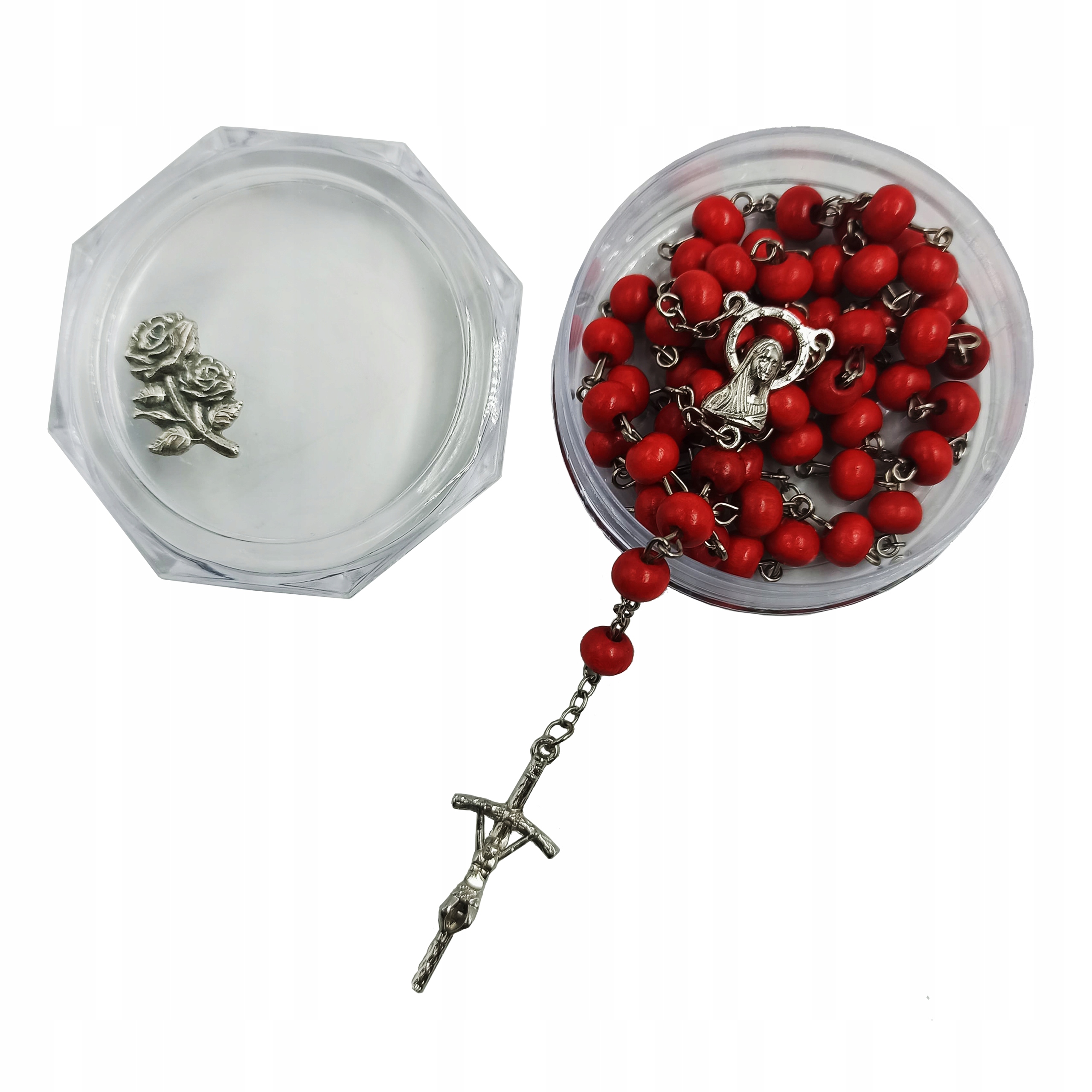 Четки дерев'яні з ароматом з металевими елементами. Червоні чотки виготовлені з дерева, а ланцюжок, з’єднувач у вигляді образу Марії та папського хреста – з металу.