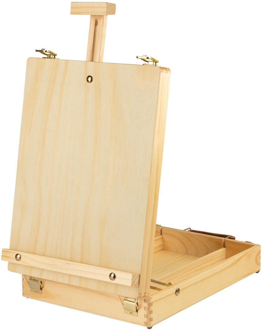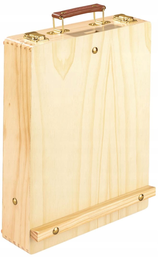 мольберт виготовлений із сосни . Розміри закритої валізи наступні: 27 x 9,8 x 36 см (ширина x висота x) Зовні, валіза оснащена полицею , що дозволяє виправити полотно до 56 см.
