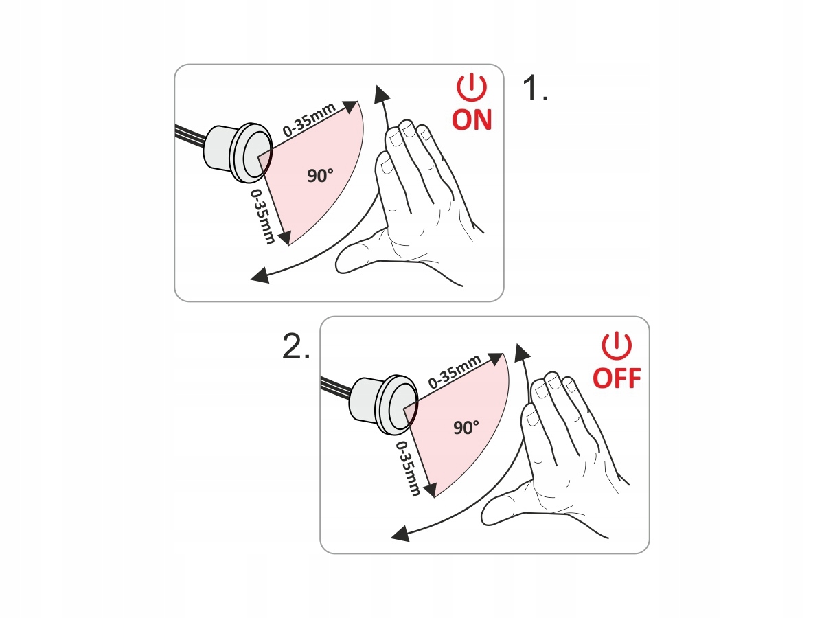 Рух в зоні датчика (до 35 мм) вмикає освітлення, а повторний рух в зоні датчика вимикає освітлення.