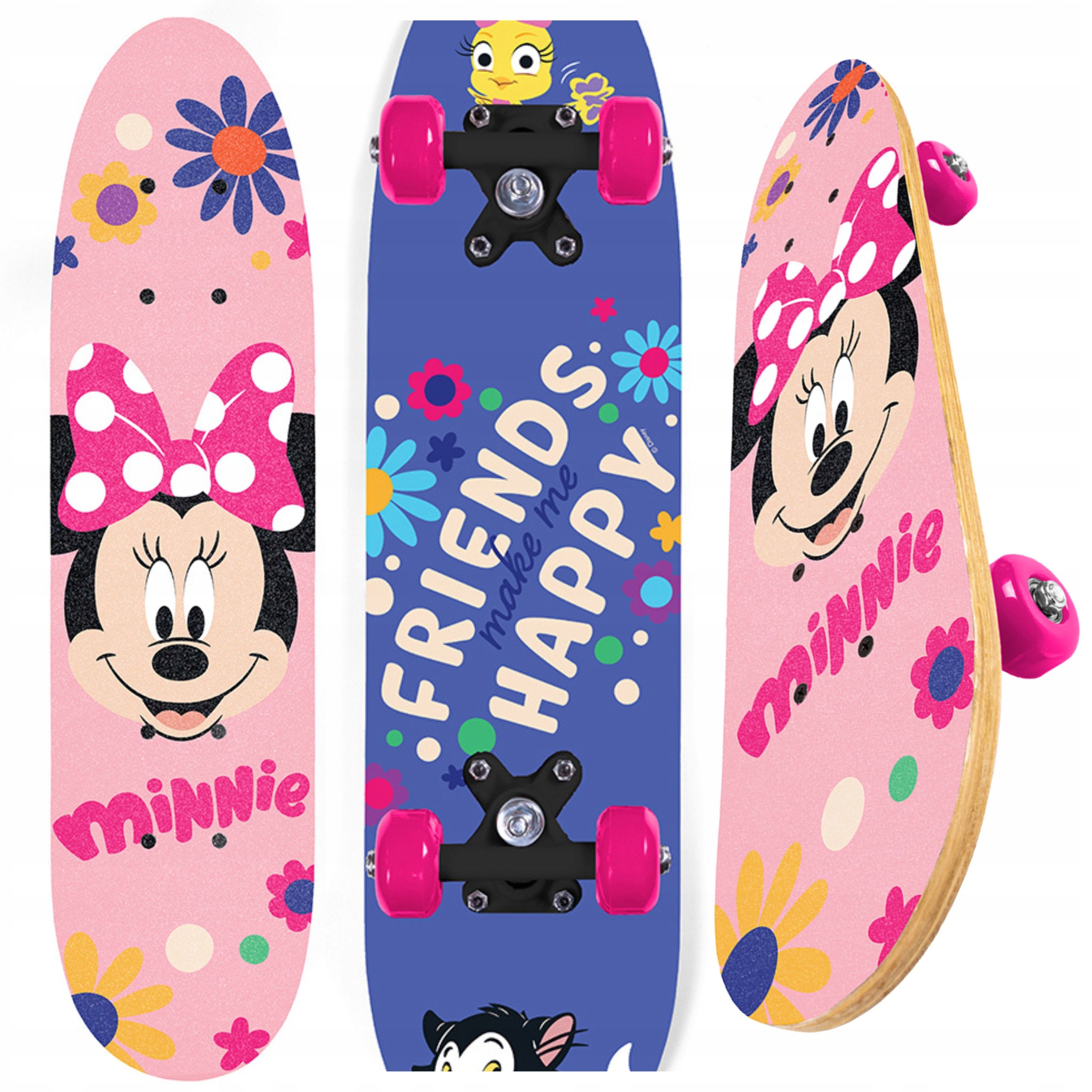 Дерев'яний скейтборд, прикрашений модними ліцензійними візерунками Мінні. Ідеально підходить для їзди по тротуарах, площах і міських алеях. Дошка виготовлена з міцної деревини. Має нековзку поверхню, що забезпечує зчеплення та підвищує безпеку. Невеликі розміри та вага дозволяють легко та зручно транспортувати.