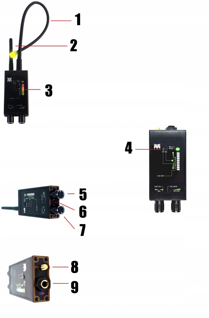 - Робоча частота: 1 МГц - 8 ГГц (усі базові шпигунські передавачі)