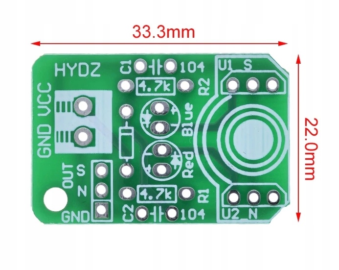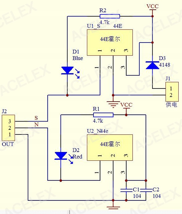 Північний полюс магніту світиться червоним індикатором, висновок N видає низьку напругу.