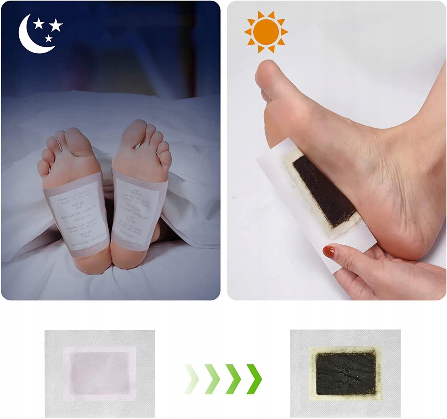 🌿 Натуральні детоксикаційні пластирі для ніг: 2 детоксикаційні пластирі на ніч для комфортного сну. Оскільки кожна нога потіє по-різному, подушечки підходять по-різному і можуть легко відірватися та забруднити постільну білизну. Найкраще використовувати детоксикаційні пластирі для ніг і носити шкарпетки.