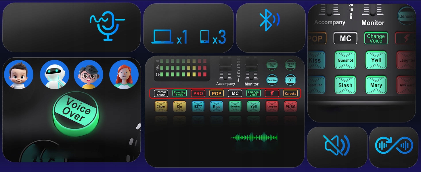 Звукова карта дозволяє вам насолоджуватися 16 фіксованими фоновими звуками спеціальних ефектів, 7 режимами подкастів і запису, 4 режимами конвертації голосу, 4 спеціальними функціями (шумозаглушення/скасування/голосування/внутрішнє відтворення), що робить ваш подкаст і пряму трансляцію веселішими. Ідеально підходить для проектних/домашніх застосувань.