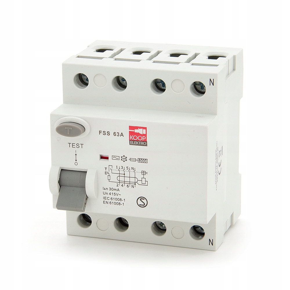 Автоматичний вимикач KOOP Elektro FSS 4P 63A — це електричний захисний пристрій, який від’єднує ланцюг, коли виявляє, що електричний струм, що витікає з нього, не дорівнює струму, що протікає.
