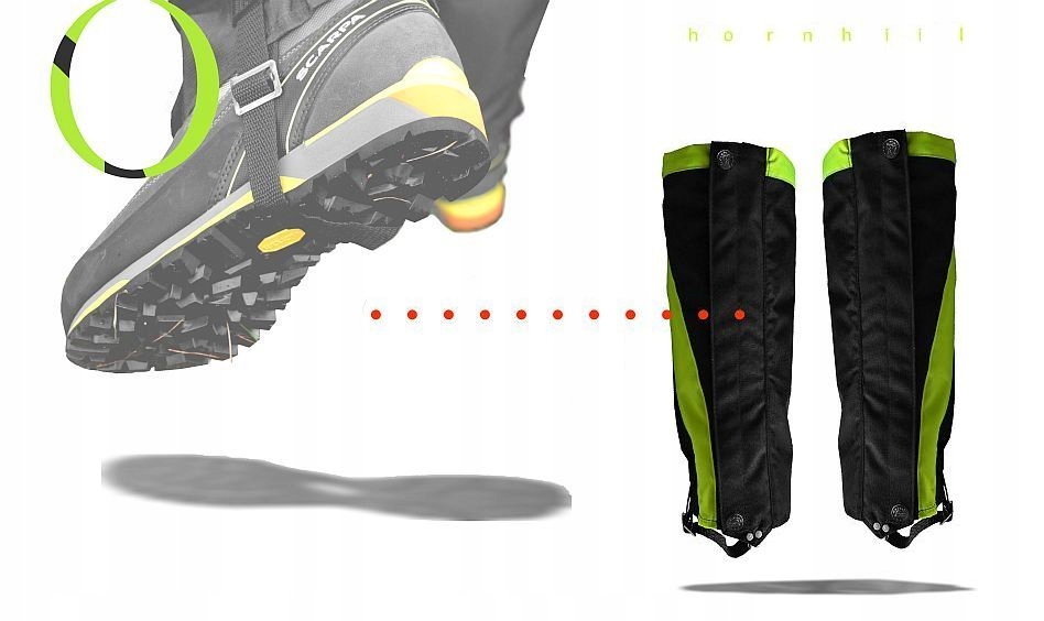 Гетри Hornhill M-Snake застібаються спереду на блискавку, закріплюються за допомогою Стрічка-липучка і кнопки /зверху і знизу/. Гетри спеціально профільовані спереду (вони довші), тому вони краще сидять на взутті і додатково прикривають отвори для шнурка. Спереду вони мають металевий гачок для шнурка. Під взуттям є ремінь для перенесення, який застібається на металеву пряжку.