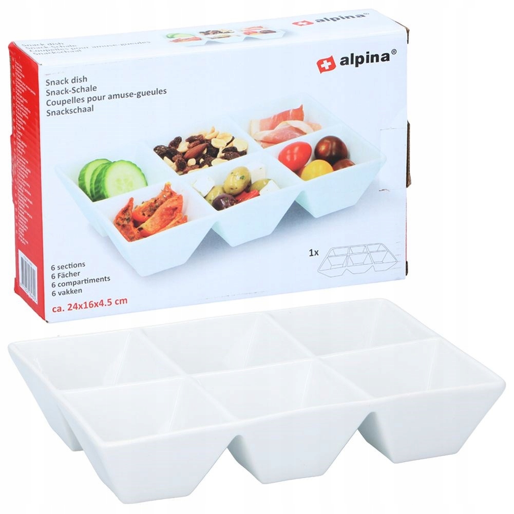 Прямокутна миска для закусок, розділена на шість менших мисок. Чашки зроблені міцно. Надзвичайно корисний у повсякденному використанні, а також під час зустрічей. У них можна подати солоні закуски, солодощі або соуси. Білий колір красиво виглядає на столі, будучи декоративним елементом, який поєднується з рештою посуду. Оригінальний продукт голландського бренду Alpina. Вироблено відповідно до європейських стандартів.
