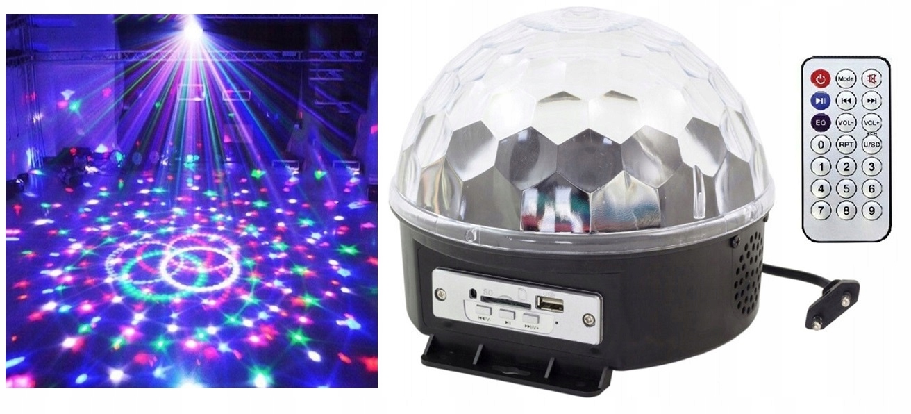 Дискотечна куля з вбудованим MP3-плеєром, пристроєм для читання SD-карт, портом USB і високоякісними стереодинаміками.