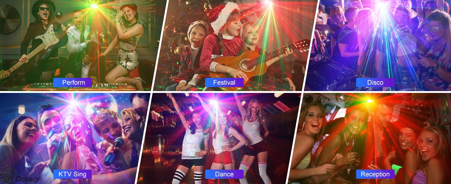 - АВТО/СПАЛАТ/Звук активований, ви можете просто вибрати бажаний режим, червоний і зелений промінь світла за допомогою фоновий світлодіод RGBW може світитися/рухатися/зливатися/з’являтися/зникати/блимати в ритмі музики, насолоджуватися чудовим танцем вашого партнера на вечірці