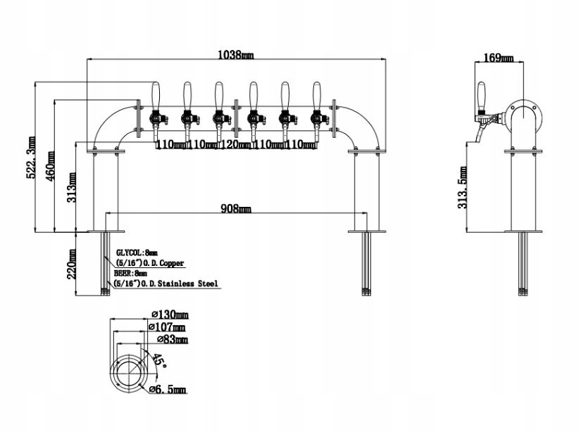 Диспенсер для пива "U" колонка, шестикран, коричневий