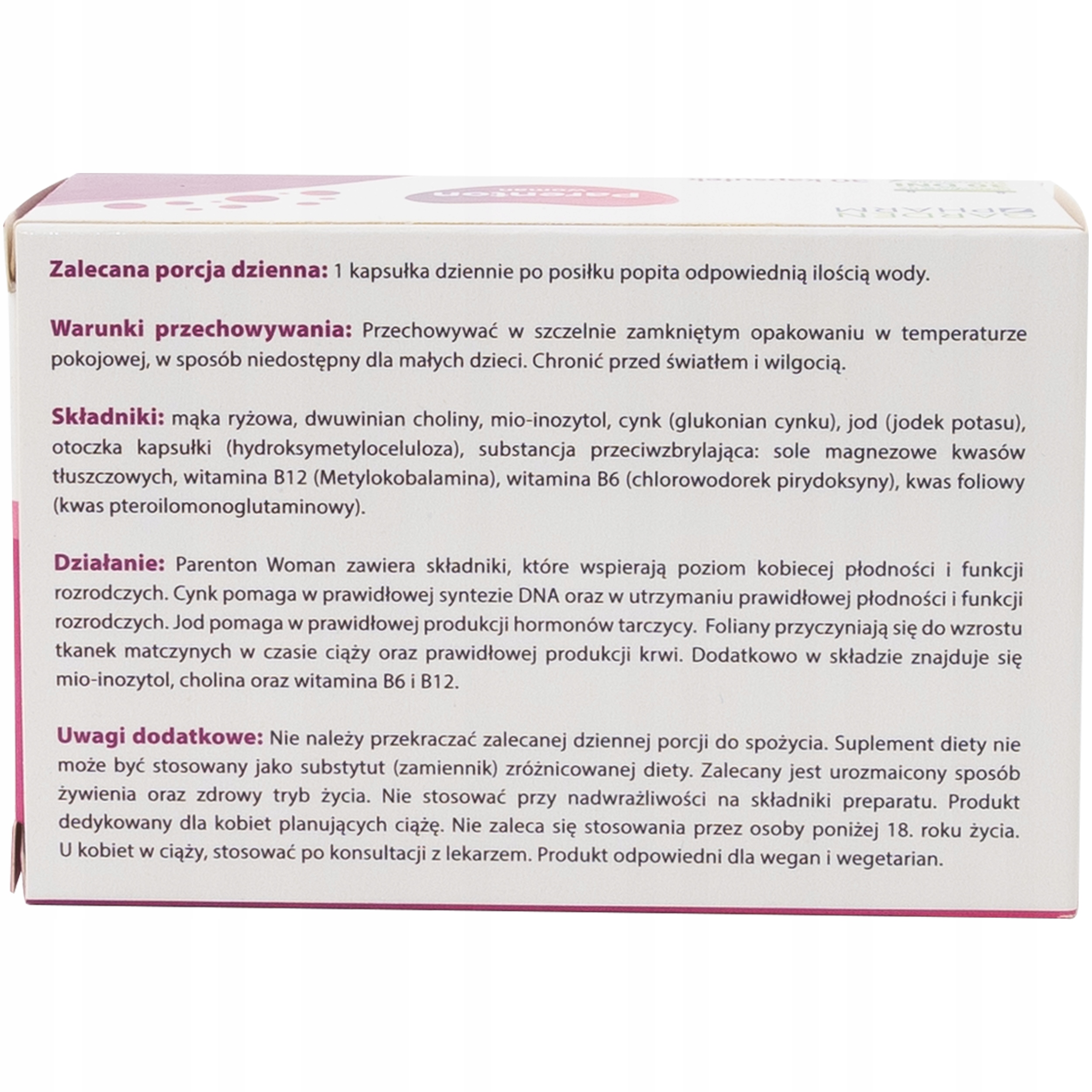 Парентон Вуман - це спеціально розроблений препарат для жінок, які планують вагітність і бажають підтримати свій організм у підготовці до материнства. Добавка містить необхідні вітаміни та мінерали, які відіграють ключову роль у правильному функціонуванні жіночої репродуктивної системи. Фолієва кислота, необхідна для правильного розвитку плоду, йод, що впливає на вироблення гормонів щитовидної залози, цинк, що підтримує синтез ДНК, і вітаміни B6 і B12, які сприяють підтримці правильного енергетичного обміну. Крім того, міоінозитол і холін допомагають регулювати біохімічні процеси в організмі, що важливо для підтримки фертильності.