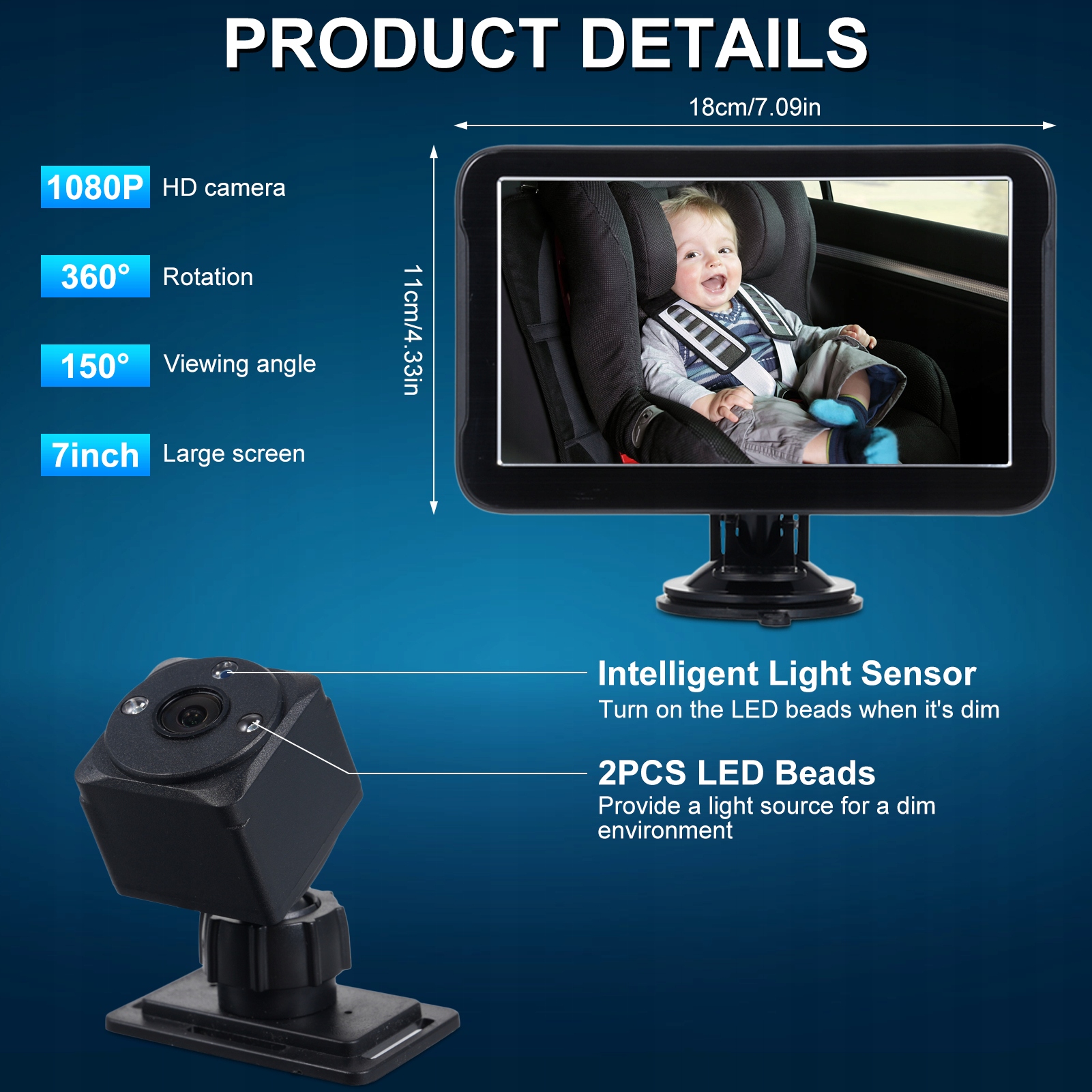 2. Можливості камери преміум-класу: Ця дитяча автомобільна камера забезпечує дивовижну роздільну здатність 1080p і широкий огляд 150°, захоплюючи кожну мить на задньому сидінні. Його низька ефективність освітлення 0,001 LUX та ІЧ гарантує оптимальну видимість навіть у темних умовах.