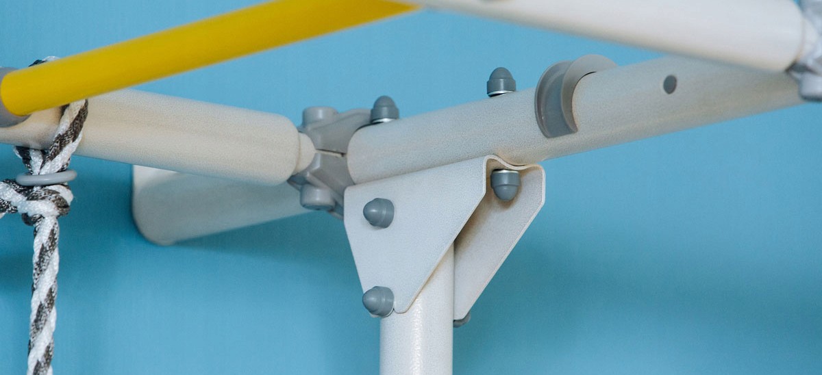 Продукти створено з особливою ретельністю та продумано до кожної деталі. Конструкція поєднує металеві, пластикові та дерев'яні елементи. Всі кріплення - гвинти і гайки - приховані під пластиковими заглушками, металеві кінці мають рівні, гладкі поверхні. Гімнастичне приладдя підвішується на кліпсу-направляючу, що запобігає ковзанню по драбині. Драбина набуває естетичного вигляду і добре виглядає в приміщенні.