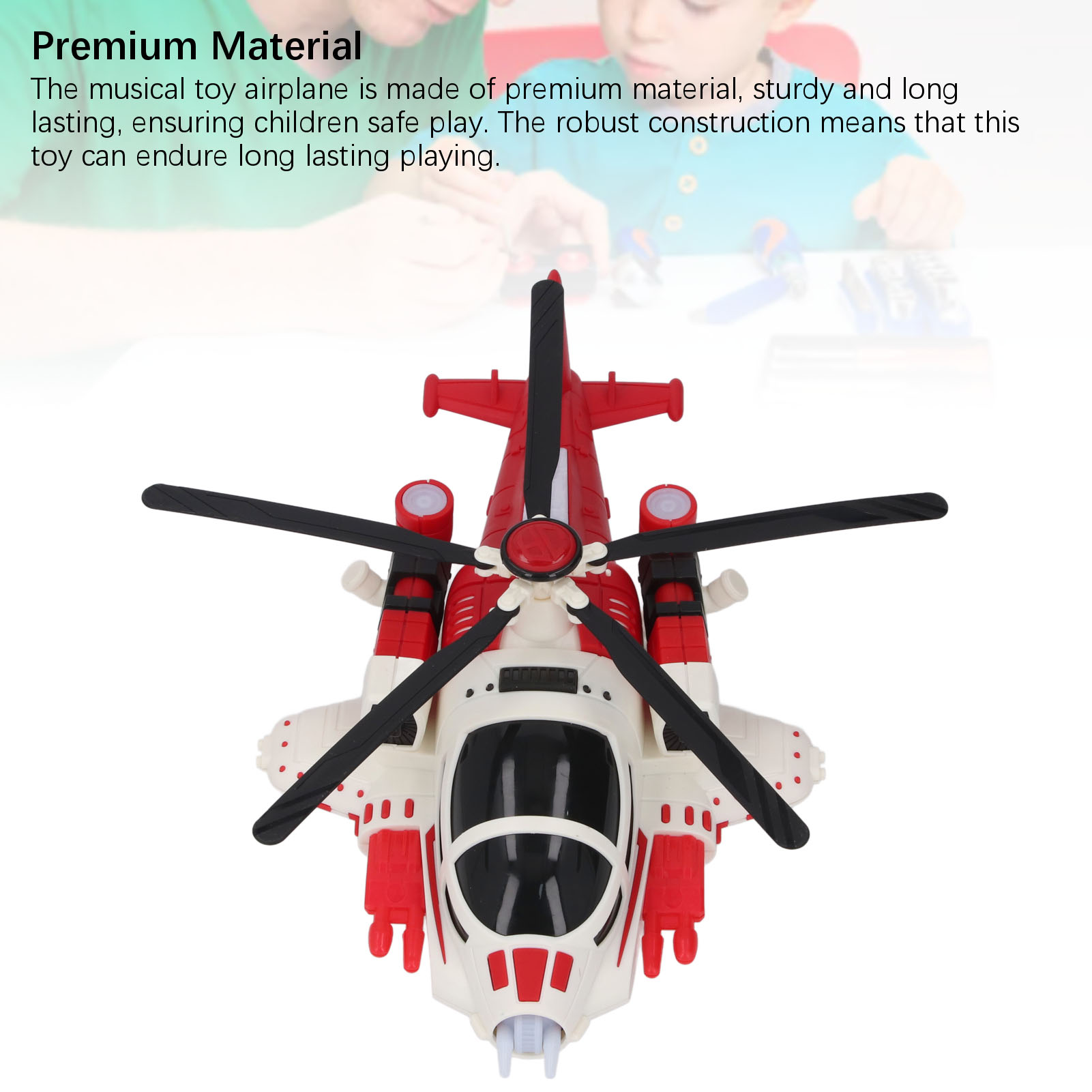 1. Матеріал преміум-класу: музична іграшка-літак виготовлена з міцного та довговічного матеріалу преміум-класу, завдяки чому діти можуть безпечно грати. Міцна конструкція означає, що ця іграшка може витримати тривалу гру.