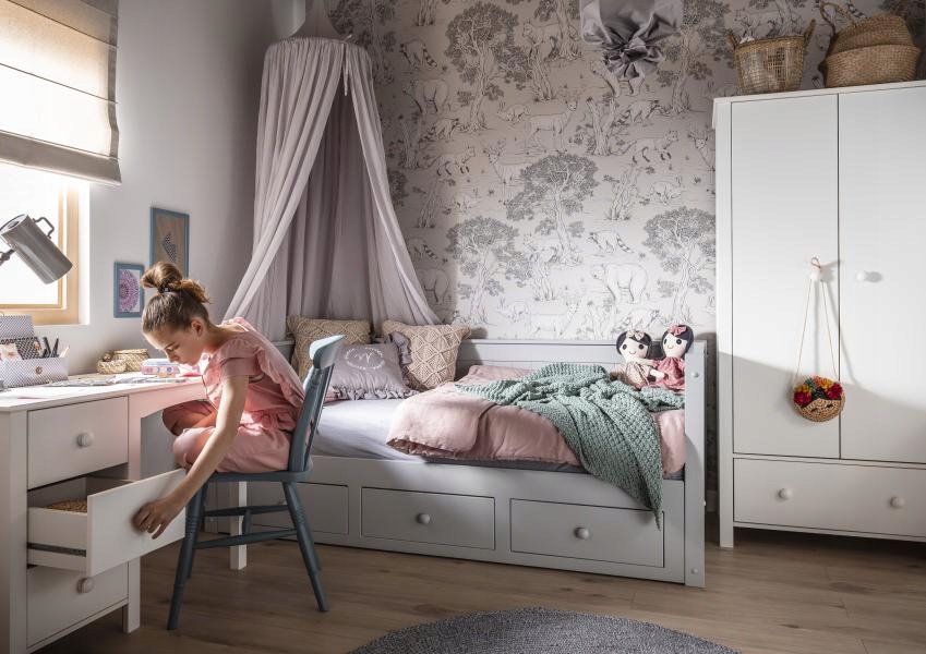 Письмовий стіл з колекції Collet - це простора стільниця, що забезпечує достатньо місця для навчання, і три місткі ящики, в які легко помістяться шкільне приладдя, зошити, підручники та інші дрібниці. Це функціональний і красивий предмет меблів, чий мінімалістичний стиль і проста форма, підкреслена дерев'яними ручками, довгі роки прикрашатимуть дитячу кімнату.
