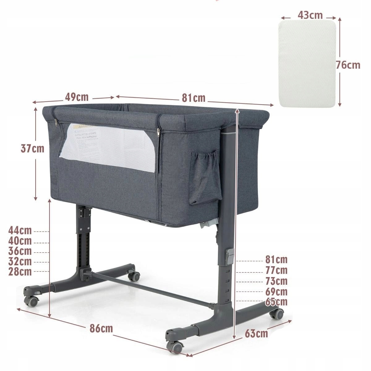 Модель легка, мобільна та оснащена коліщатками, що фіксуються, що дозволяє вільно переміщати її між кімнатами. Міцний сталевий каркас гарантує стійкість, а м'який матрац забезпечує дитині комфортні умови для сну.