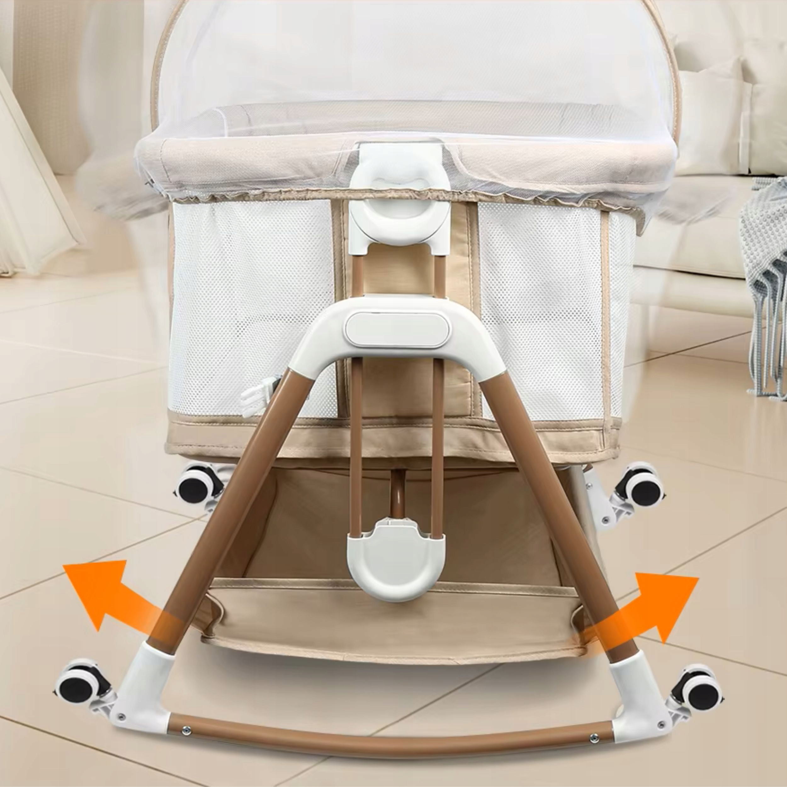 ✅ Найголовнішою його перевагою є зручність використання: зміна висоти, перемикання в режим гойдання або залягання в ліжко відбувається за кілька секунд і без жодних зусиль. Дихаюча лляна тканина та москітна сітка забезпечують комфорт дитини, а стійка конструкція з фіксованими колесами забезпечує безпеку.