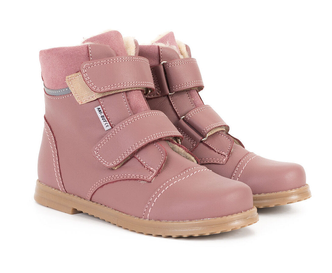 Профілактичні зимові черевики для дівчаток, застібаються на липучки. Виготовлений найвищої якості якісна натуральна шкіра з гігроскопічними властивостями, завдяки чому нога не потіє. Салон утеплений товстою дублянкою з 100% натуральної овечої вовни.