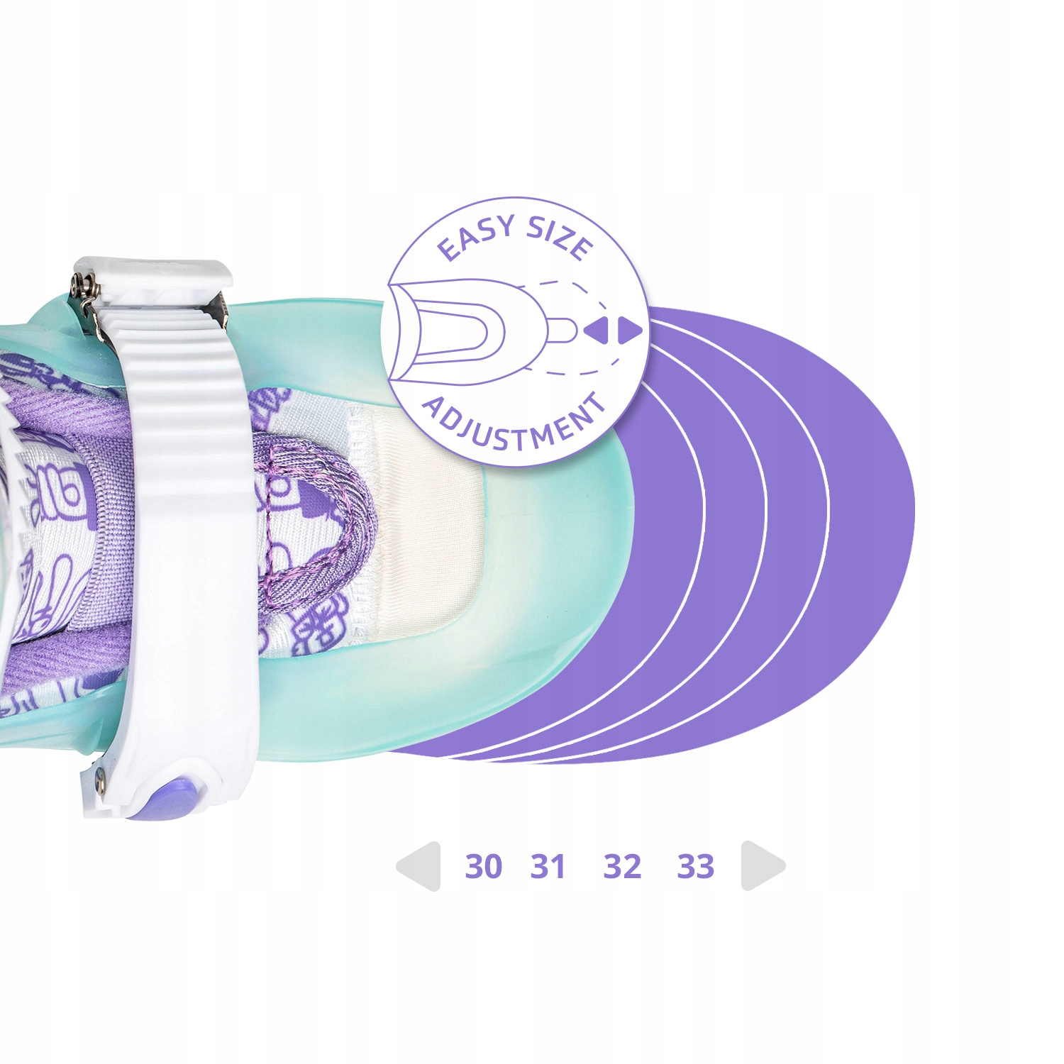 РЕГУЛЮВАННЯ РОЗМІРУ. За допомогою однієї ви можете змінювати розмір взуття, регулюючи його довжина до стопи малюка (діапазон регулювання розміру S - 30-33) . Завдяки цьому роликові ковзани прослужать дитині довше.