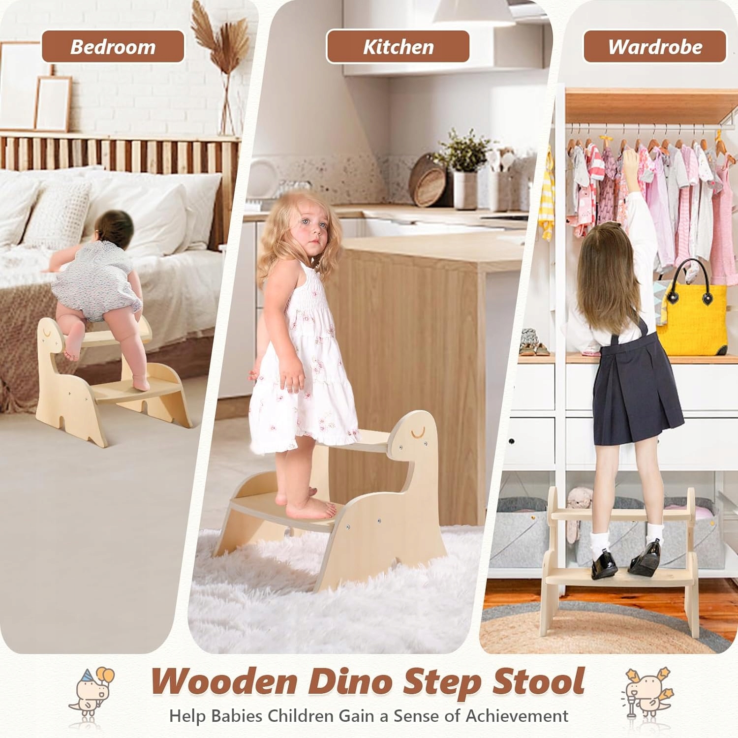 WOODEN- дерев’яні сходинки з мотивом динозавра висотою 33 см виготовлені з натурального та приємна якісна деревина. Завдяки милому дизайну динозавра немовлята та малюки захоплюються дизайном і охоче пробують щось самостійно та роблять більше з вежею. Двоступеневе дерев'яне крісло для навчання забезпечує більшу стабільність і довговічність.