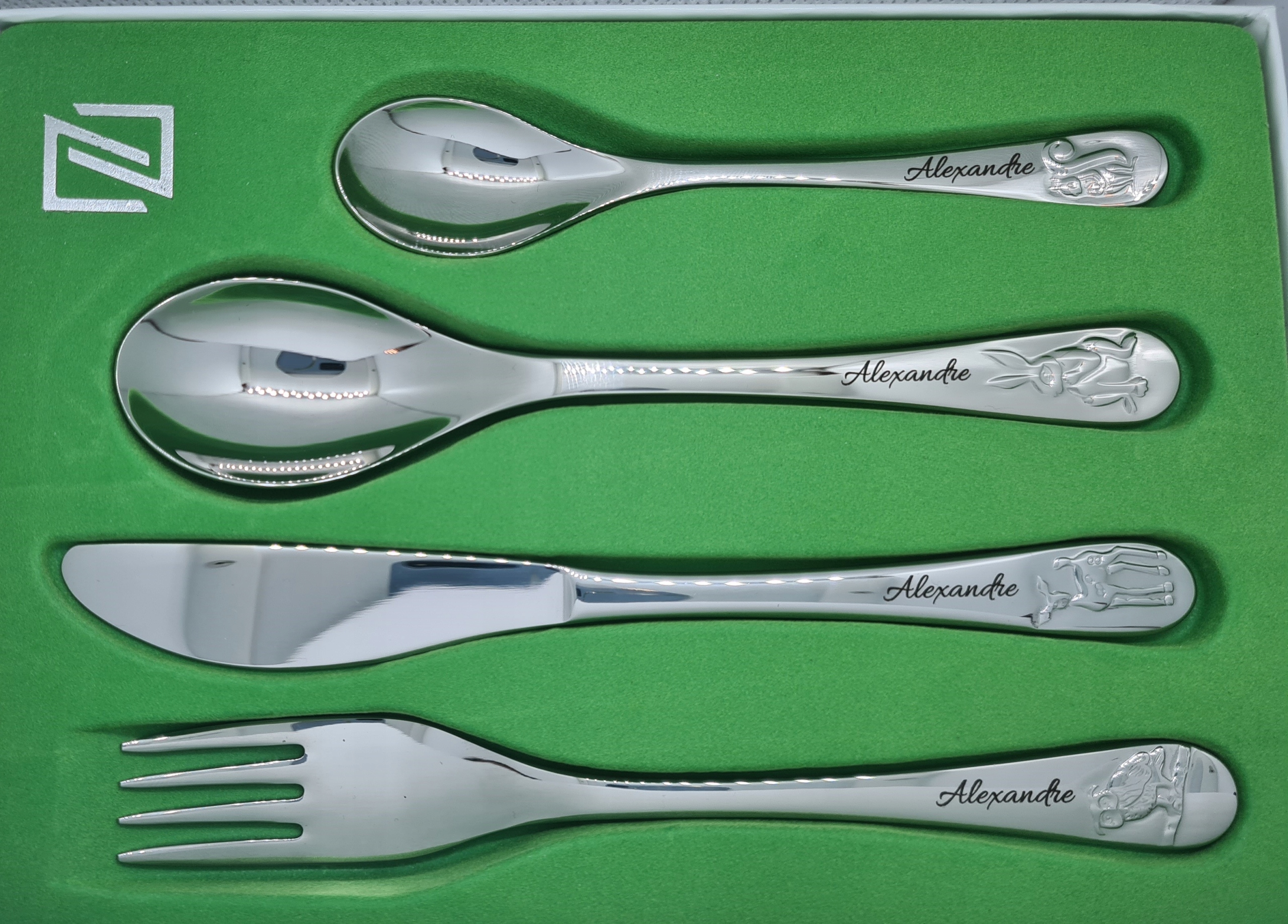 набір 4 елементів, вилки (16 см), ніж (17 см), ложка (16 см), невелика чайна ложка (13 см). Стоки, прикрашені елементами тварин. Упакований у барвисту картонну коробку. 18/10 столових приладів для гравірування підходить для миття в посудомийній машині.