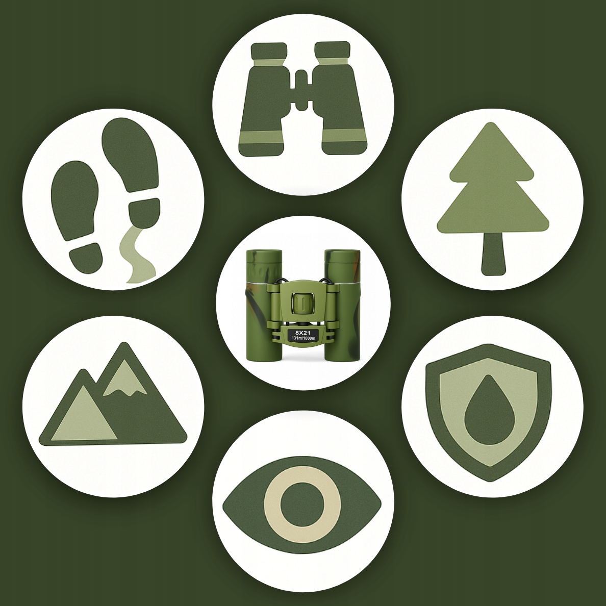 Цей бінокль 8×21 є ідеальним вибором для юних дослідників і дорослих, які хочуть насолоджуватися чіткими зображеннями, легкістю та зручністю використання за будь-яких умов місцевості.
