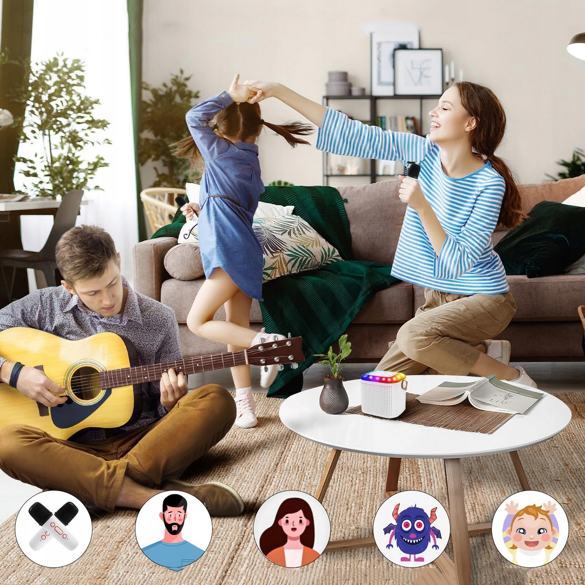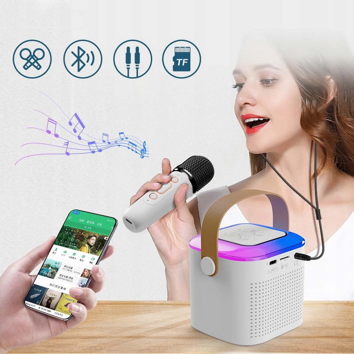 Міні-набір для караоке для дітей, який ви можете легко взяти з собою куди завгодно. Ефективні аудіоперетворювачі та передові процесори цифрових сигналів забезпечують чистий звук, помірну гучність і відсутність перешкод. Шкіряна ручка дозволяє легко носити або вішати, тому цей набір для караоке для дівчаток дозволяє дітям насолоджуватися співом зі своєю сім’єю будь-де.