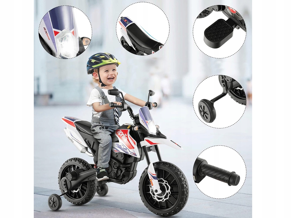 Дитячий крос-велосипед Aprilia RX125 на акумуляторі, ліцензований брендом. Дитячий автомобіль на акумуляторі створений для найменших шанувальників бренду та всіх маленьких любителів мотоциклів. Мотоцикл виготовлений дуже ретельно, з увагою навіть до найменших деталей, з матеріалів найвищої якості. Усе це робить транспортний засіб дуже реалістичним.