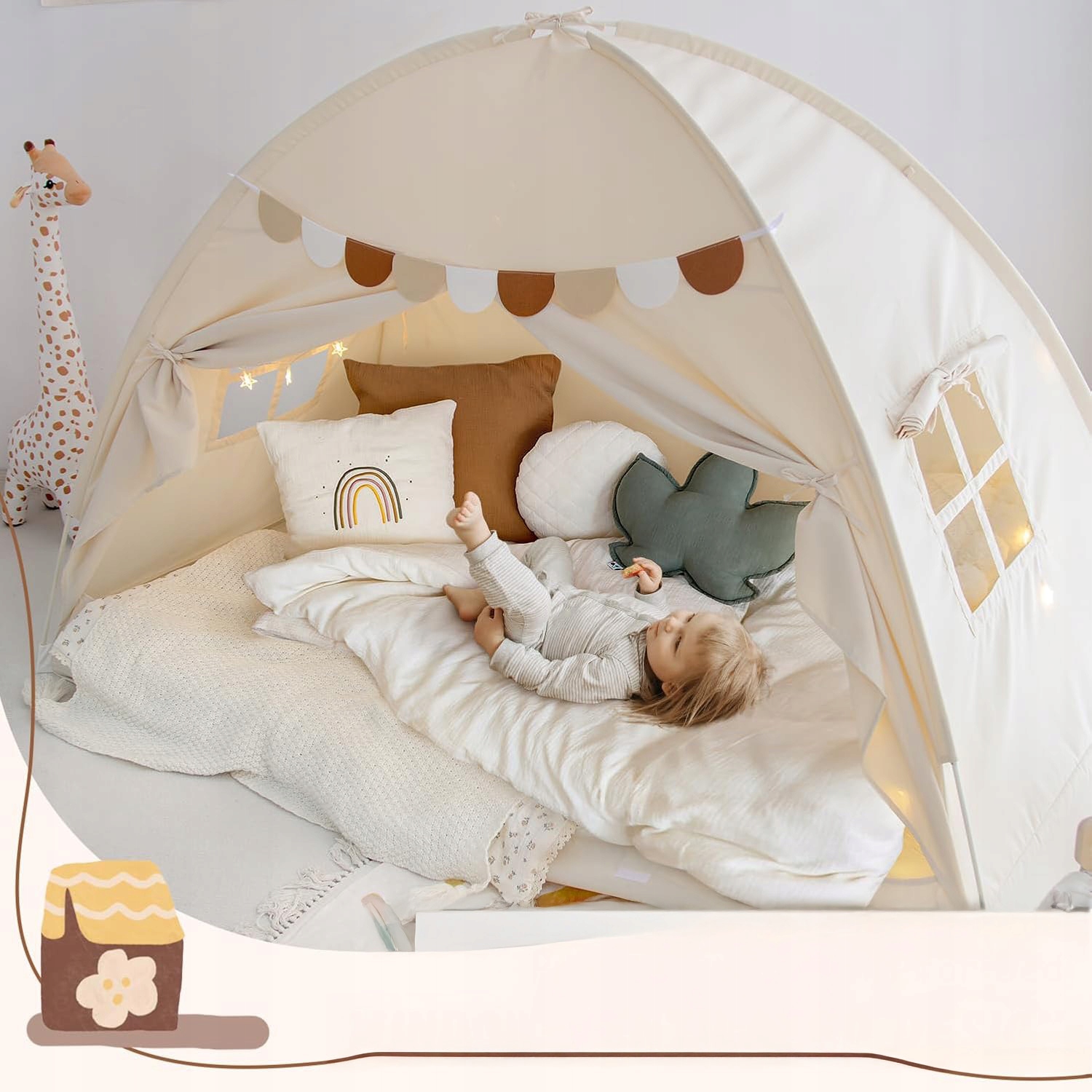 - ✔️Оснащений світловою ниткою у формі зірки та кольоровими прапорцями, він створює романтичну атмосферу, де діти можуть спати, грати, читати тощо.