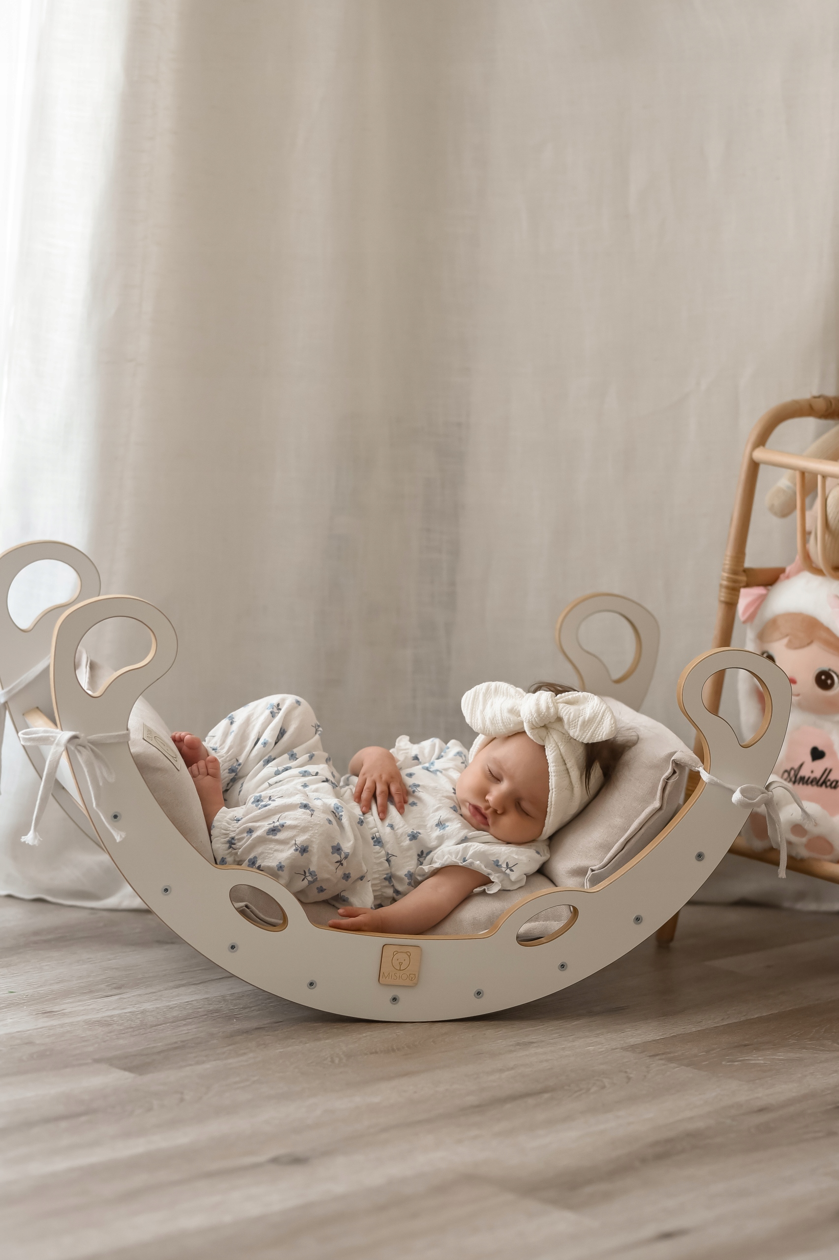 м'яка подушка прикріплена до набору робить його чистим. Переверніть рокер на інший бік, і він перетворюється на суцільну драбину, ідеальну для маленьких дослідників та альпіністів.
