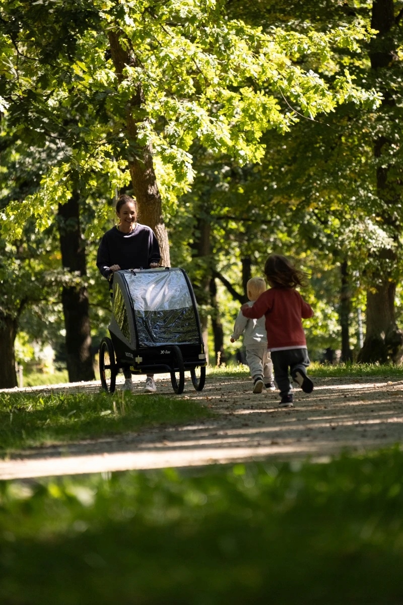 Ця модель є версією 3-в-1, тобто професійним велосипедним причепом, біговою коляскою, яка відповідає всім стандартам, і коляскою для двох осіб.