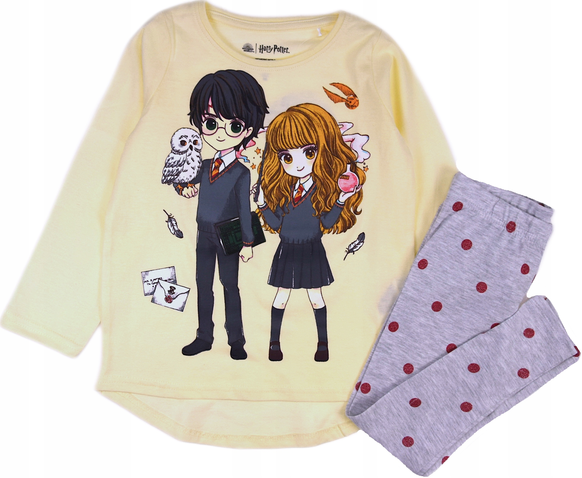 Оригінальна ліцензійна дівоча піжама. Приємний і ніжний до тіла. Піжама з улюбленими героями Гаррі Поттером і Герміоною. Блузка простого вільного крою - подовжена ззаду. Штани на резинці, приталені - легінси.