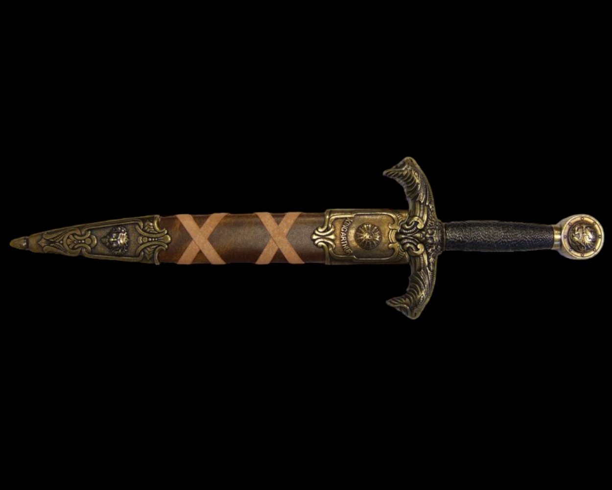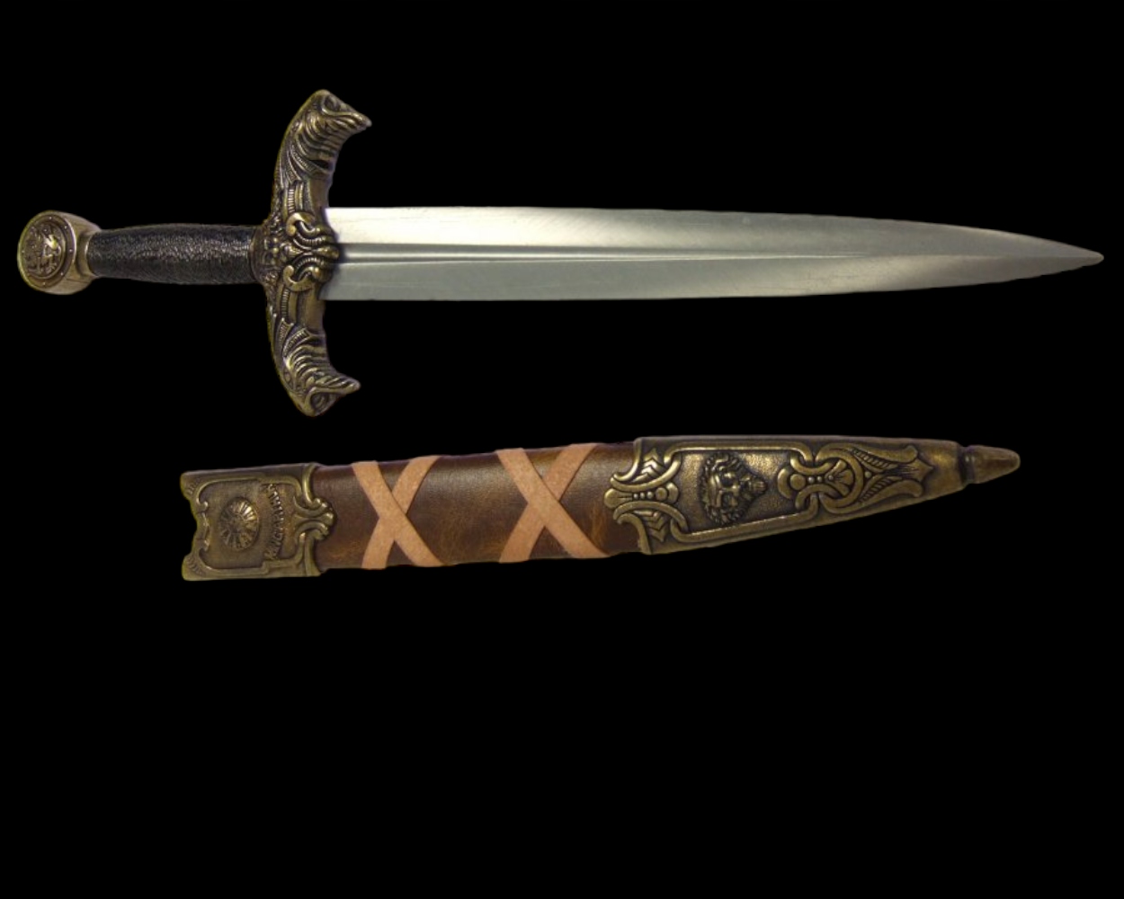 Репліка, яку ми представляємо вам, є добротною моделлю кинджала короля Артура. Варто відзначити дуже ретельну обробку копії цього чудового кинджала, для якої використовувалися тільки найкращі матеріали: сплав цинку, алюміній і шкіряний матеріал (піхви). До кинджала короля Артура ми кріпимо елегантні піхви, що робить представлену репліку справді якісним виробом.