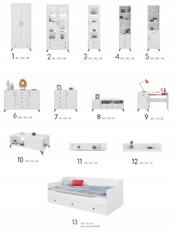 Системні меблі Giza - ідеальна пропозиція для приглушених інтер'єрів. Суто біла поверхня фронтів у глянці разом із характерними чорними ручками та ногами буде виділятися з цілого. Серія ідеально впишеться у вітальню та молодіжну кімнату завдяки 13 доступним блоком, до яких належать сайти, стіл або навіть ліжко.