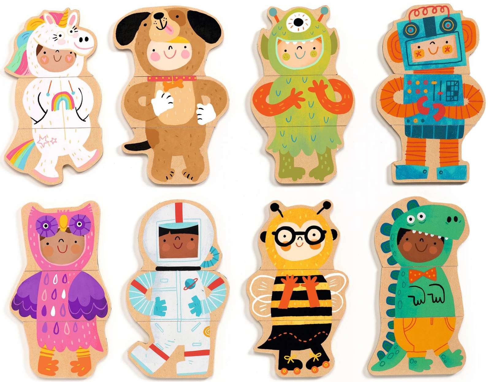 Набір із 24 дерев’яних магнітів для складання костюмів для маскарадної вечірки чи створення божевільних комбінацій — ідеальна іграшка для дітей віком від 2 років.