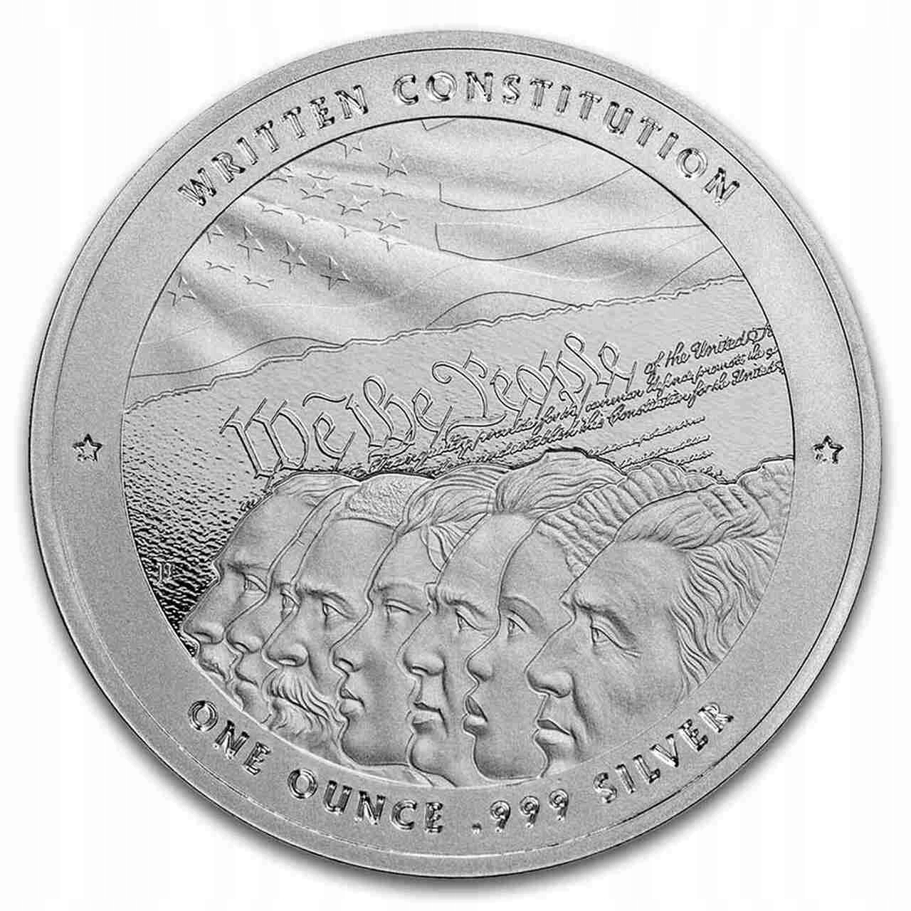 На аверсі зображено американський прапор, що майорить на вітрі, із верхньою частиною Конституції США. Під ним ми бачимо зображення людей різного походження.