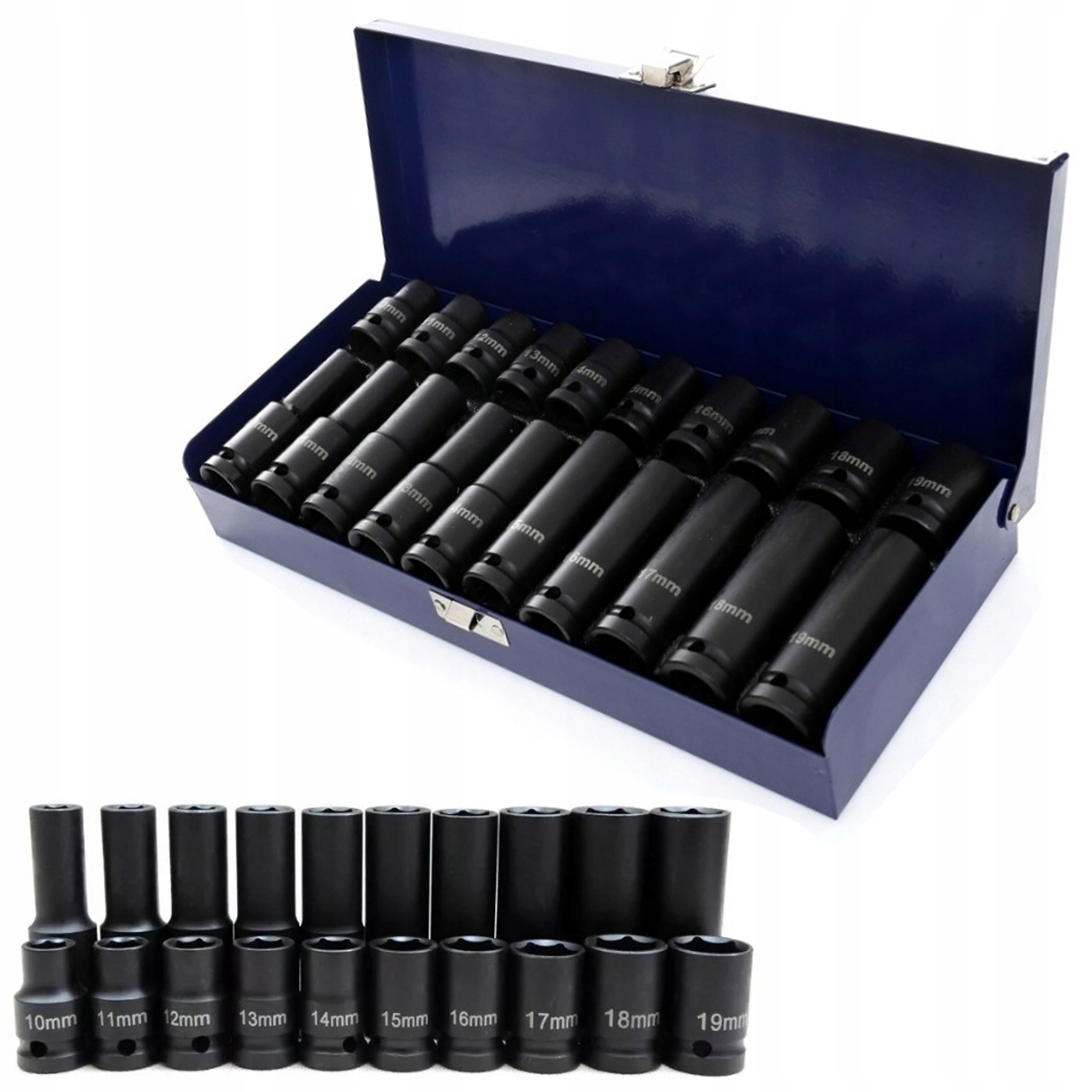 Набір ударних ковпачків 1/2 "довгих шестикутників (78 мм) і коротких (38 мм), складається з 20 елементів. Він містить шестикутні удари в популярних розмірах від 10 до 19 мм. Зберігання валізи. Оксид.