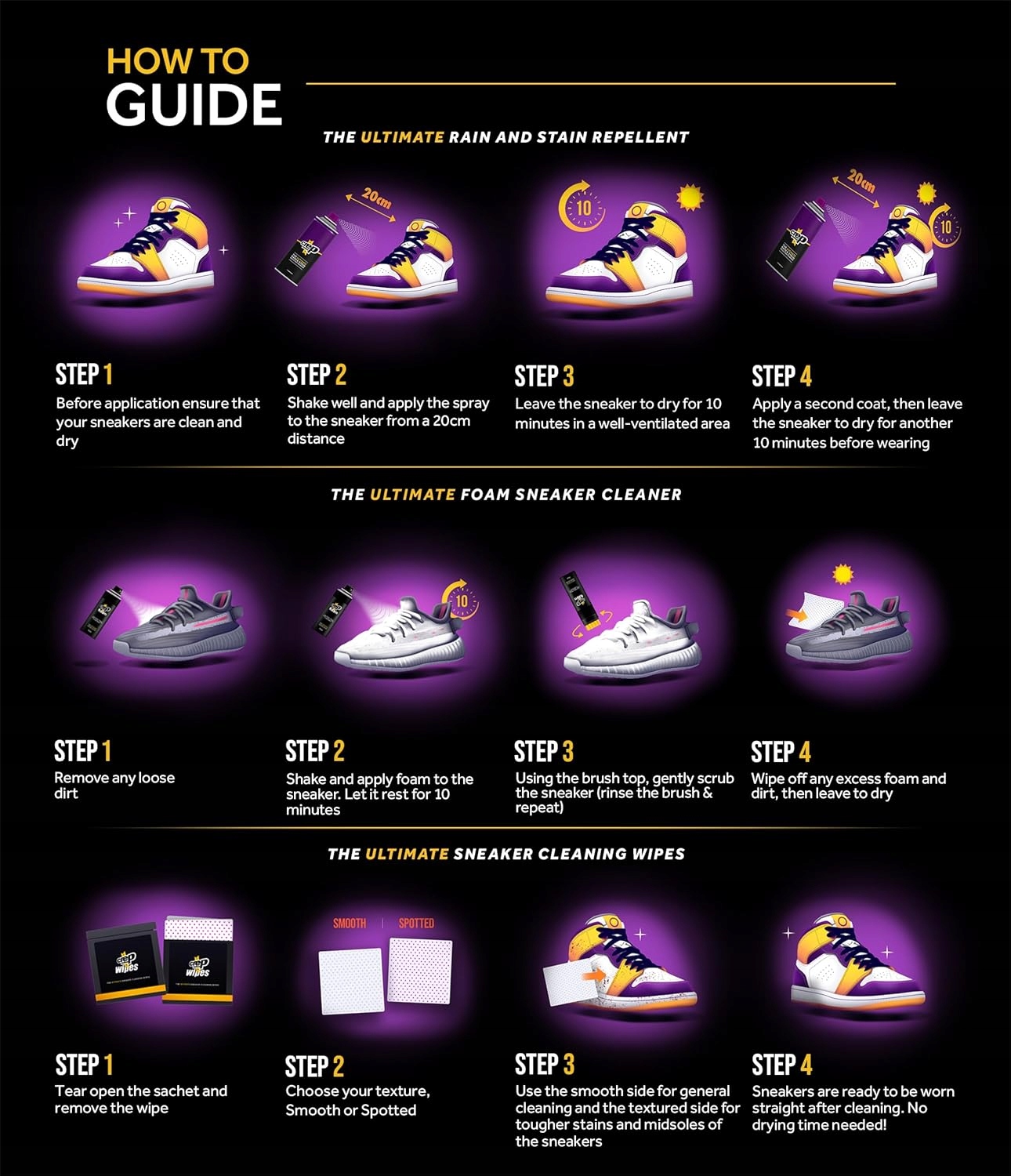 Це найкращий пакет для захисту взуття. Завдяки поєднанню зручного у дорозі спрею Crep Protect, серветок і піни ви зможете довше зберегти свіжість свого взуття. Інноваційна формула спрею створює невидимий бар'єр, який відштовхує рідини та бруд, а серветки чудово видаляють увесь бруд та пил, які вже осіли на взутті. Нарешті, піна забезпечує максимальний захист від пошкодження водою та зміни кольору. Завдяки цьому комплексному пакету Crep Protect ви зможете зберегти своє взуття в первозданному стані – незалежно від того, куди вас занесе життя.