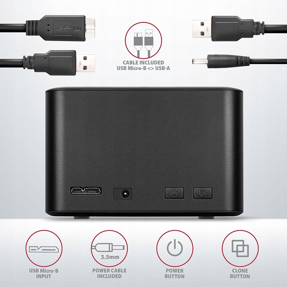 SuperSpeed USB 5 Гбіт/с AXAGON ADSA-D25 CLONE MINI док-станція/станція для клонування - легко та швидко підключіть до комп'ютера два накопичувачі 2,5" одночасно. Підключення до комп'ютера можливе через роз'єм USB Micro-B в док-станцію разом із USB-кабелем USB Micro-B -A, що входить до комплекту.