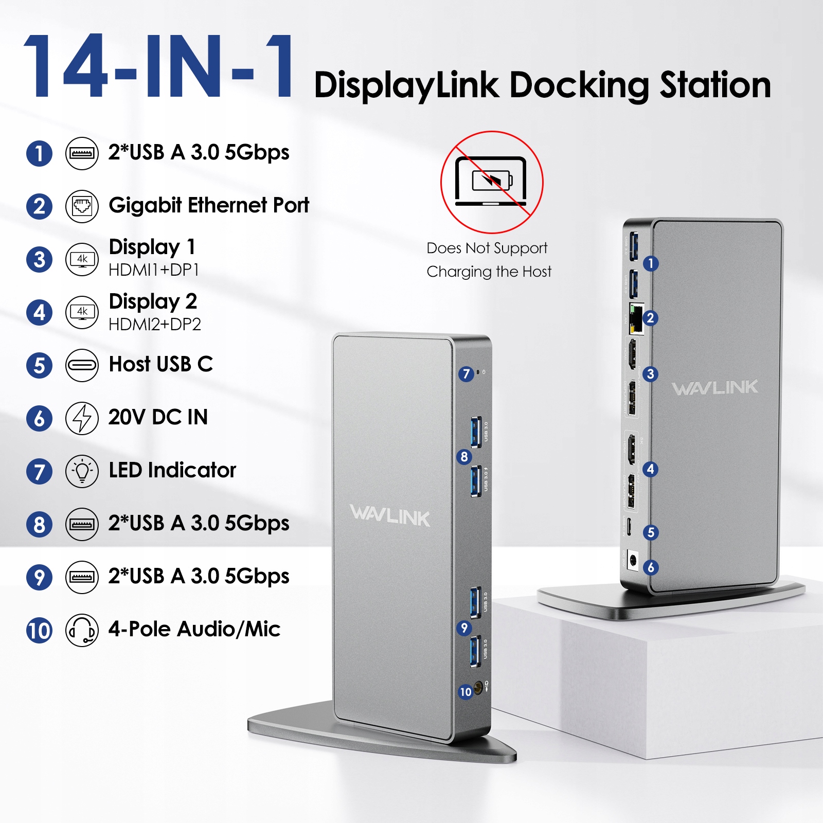 Док-станція WAVLINK 14-в-1 розкриває повний потенціал вашого ноутбук із 5K DISPLAY 1 (DP1+HDMI1), 5K DISPLAY 2 (DP2+HDMI2), 6 портами USB-A 3.0 5Gbps, портом Ethernet 1000Mbps, входом 20V DC PD і аудіороз’ємом 2 в 1 Примітка: у одна група відеопотоку (DISPLAY 1/2), порт DP і порт HDMI не можна використовувати одночасно. Якщо монітори мають порти HDMI і DP, підключені до DISPLAY 1/2 одночасно, порт DP матиме пріоритет. І Windows, і Mac підтримують розширений режим і дзеркальний режим, тому ви можете оцінити кожну деталь на одному або двох моніторах.