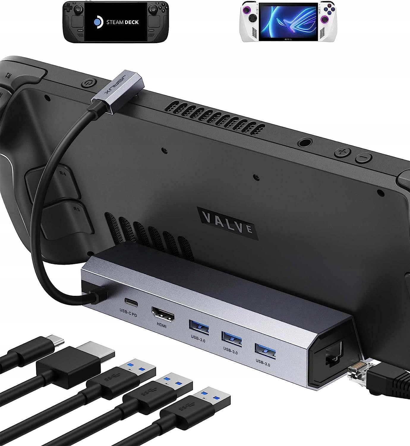 - Док-станція 6-в-1 для Steam Deck: оснащена виходом HDMI 4K@60Hz, входом Gigabit Ethernet, трьома Порти USB - A 3.0 і зарядний порт USB-C, що дає вам змогу відкрити новий спосіб гри зі Steam Deck/ROG Ally.