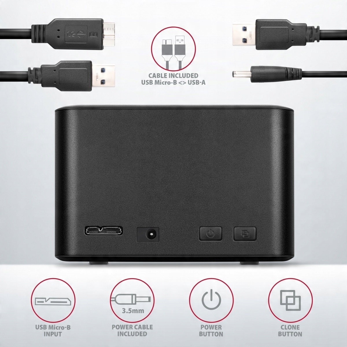 Док-станція/станція клонування SuperSpeedUSB 5 Гбіт/с AXAGON ADSA-D25 CLONE MINI легко та швидко підключає до комп’ютера два накопичувачі 2,5" одночасно. Підключення до комп’ютера можливе через роз’єм USB Micro-B в док-станцію разом із USB-кабелем USB Micro-B -A, що входить до комплекту.