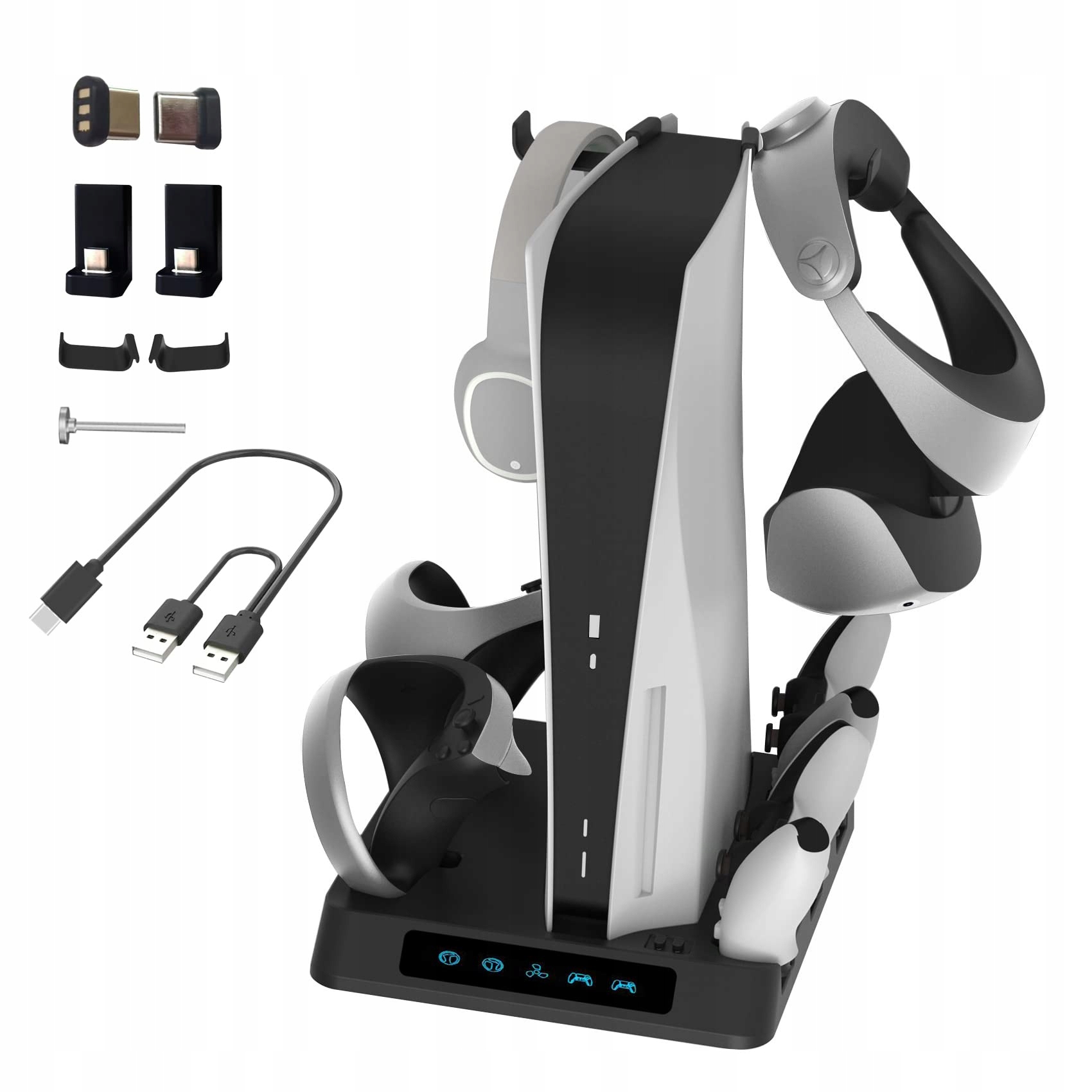Дизайн 5-в-1 для PSVR 2 і PS5. Включає вентилятор охолодження, 2 отвори для консолі PS5, 2 магнітні доки для контролера PSVR 2, підставку для зберігання з 2 світлодіодними індикаторами + 2 вихідні порти USB (2,8 A -5,28 В) + 1 вихідний порт Type-C + гвинтові монети. Забезпечення централізованого зберігання для вас.