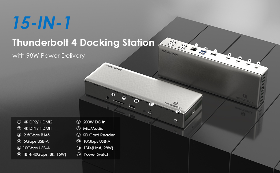 Док-станція WAVLINK Thunderbolt 4 — це універсальне рішення 15-в-1 зі швидкістю передачі даних до 40 ГБ/с. b> Забезпечує максимальну вихідну потужність 98 Вт для заряджання вашого ноутбука та 15 Вт для заряджання телефону, забезпечуючи живлення ваших пристроїв. Завдяки підтримці одного дисплея 8K або чотирьох дисплеїв 4K ви можете насолоджуватися захоплюючим зображенням і підвищувати продуктивність. Він також пропонує швидку передачу даних 10 Гбіт/с, порт 2,5G Ethernet для швидкого та стабільного підключення до мережі, аудіопорти для плавного введення та виведення аудіо та пристрій для читання карт SD V4.0 для ефективної передачі даних із SD-карт.