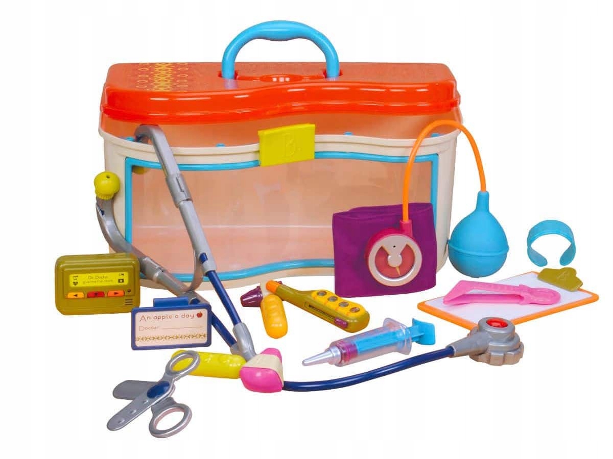 Ваша улюблена гра в лікаря може початися! Все, що потрібно маленькому лікарю, можна знайти в міцній валізі Btoys з ручкою для перенесення. У валізі — блокнот із папером, молоток, отоскоп, термометр, бинти, табличка з іменем, стетоскоп із звуком серцебиття, тонометр, пінцет, шприц, безпечні ножиці та трубка.