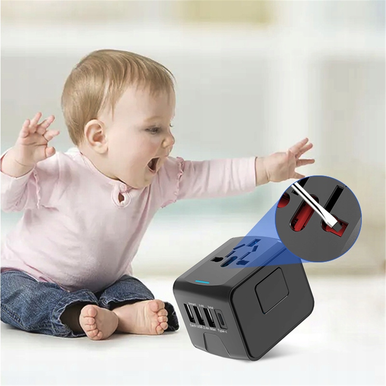 Глобальний дорожній адаптер виготовлено з імпортованого вогнетривкого матеріалу для ПК із вбудованим запобіжником 6 А, сертифікованою системою безпеки, захистом від перенапруги, захистом від ураження електричним струмом від дітей, блокуванням розетки та вбудованою кришкою, яка захищає пристрої від зовнішніх ударів і короткого замикання під час заряджання. .
