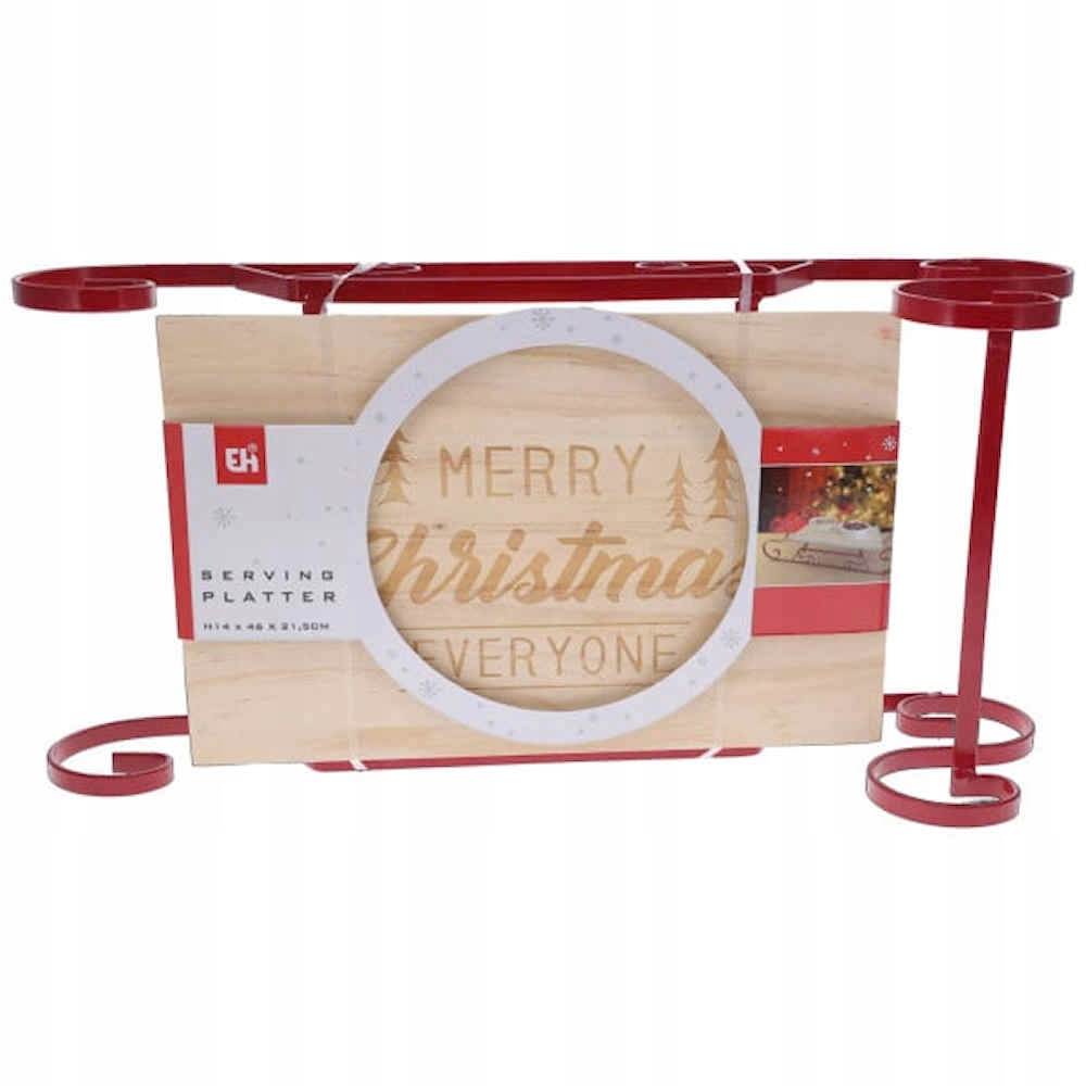 Виріб має дерев'яну тацю з тисненням «З Різдвом Христовим усім» і стійку металеву конструкцію у вигляді полозів для саней.